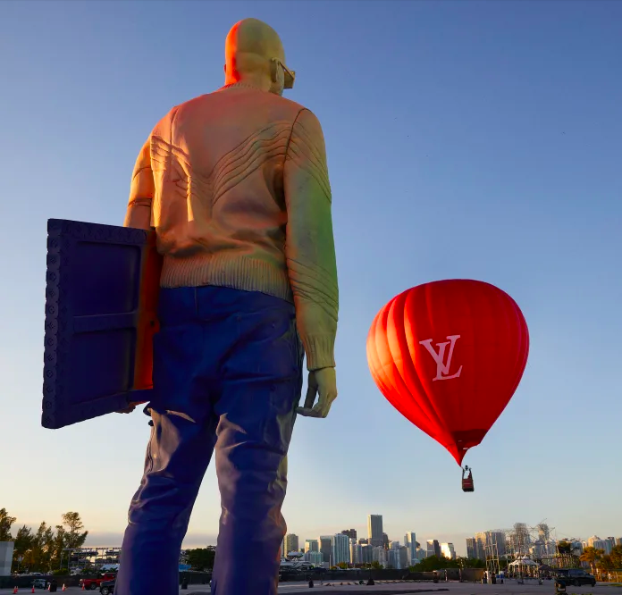 A three-story statue of Abloh erected at what would be his final runway show for Louis Vuitton, days after his death.